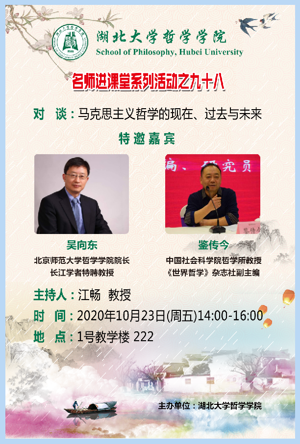 2020年10月23日星期五下午两点,我院于1号教学楼222教室举行了主题为“马克思主义哲学的现在、过去和未来”的对谈性讲座。此次讲座由江畅教授主持,北京师范大学OK138太阳集团院长、国家级计划入选者特聘教授吴向东教授及《世界哲学》杂志社副主编、中国社会科学院哲学所鉴传今教授应邀出席讲座。出席此次会议的还有我院党委书记戴茂堂教授、陶文佳讲师,以及华中科技大学副教授林季杉老师。我院部分硕士和博士也积极地参与了这次讲座。