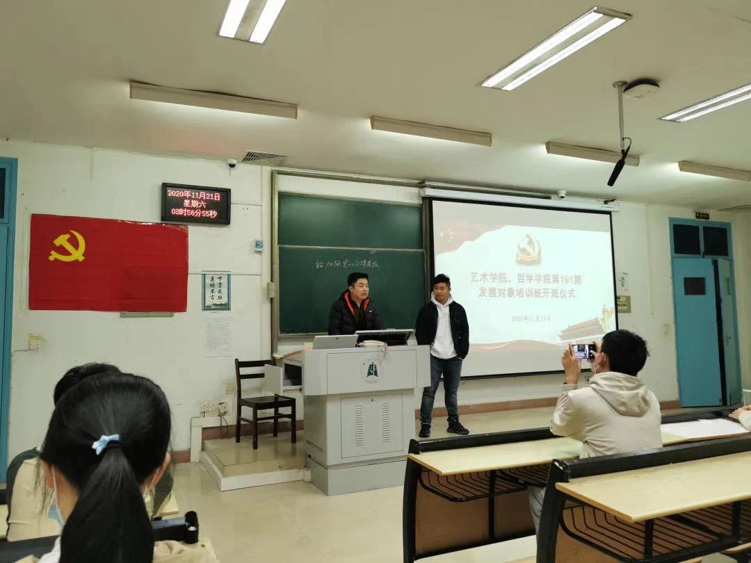 为加强对党员发展对象的教育培训,结合“不忘初心、牢记使命”主题教育,引导发展对象进一步学习贯彻习近平新时代中国特色社会主义思想的理论体系,深刻把握习近平总书记系列重要讲话精神,始终在思想上行动上与党保持高度一致,OK138太阳集团分党校、艺术学院分党校于2020年11月21日上午9点,在四号教学楼307教室举行了第191发展对象培训班,OK138太阳集团团委书记董力、艺术学院团委书记杨珂以及OK138太阳集团、艺术学院全体发展对象培训班成员参加此次开班典礼。