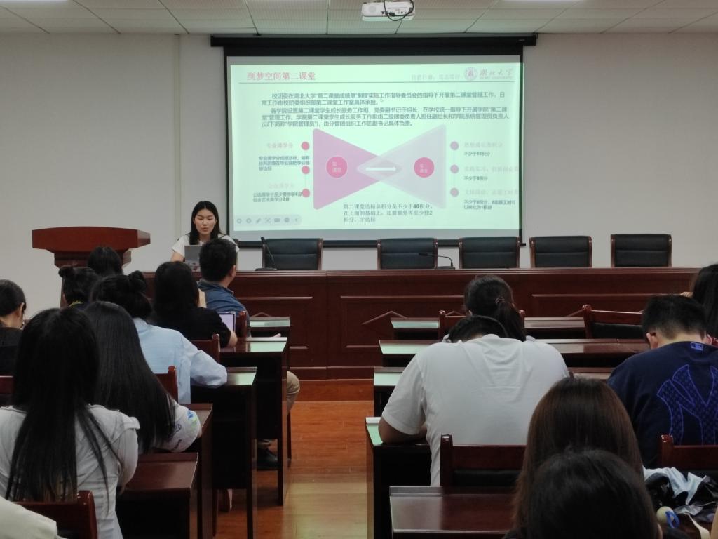 班会第二阶段,团委书记董力接过 “接力棒”,围绕第二课堂展开专题讲解。他详细介绍第二课堂积分规则与获取途径,鼓励同学们尽早行动,积极参与校内外实践活动,合理规划学分积累,为未来发展蓄势赋能。学院第二课堂负责人陈乾佳同学紧随其后,从 “到梦空间” 平台使用、毕业学分要求、学分获取方式等方面,进行系统且细致的解读,消除同学们参与实践的困惑。