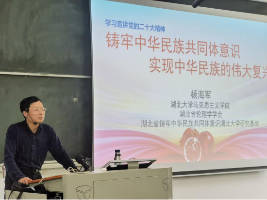 为深入开展学习贯彻习近平新时代中国特色社会主义思想主题教育,2023年4月13日至20日,湖北省伦理学学会党支部书记杨海军副教授先后深入社区、学校等宣讲党的二十大精神,让党的理论飞入寻常百姓家,用群众喜闻乐见的方式宣讲习近平新时代中国特色社会主义思想。