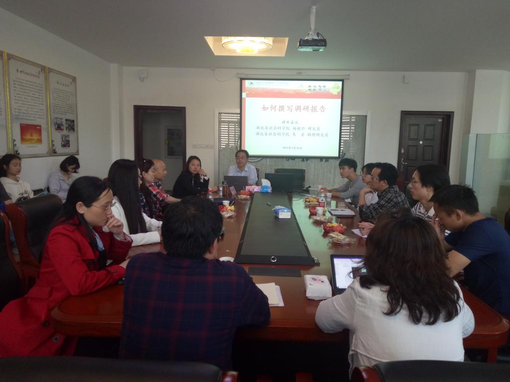4月18日下午,湖北省社科院杨值珍研究员、易君博士受邀为ok138cn太阳集团高等人文研究院、湖北农村社区研究中心师生传授如何撰写调研报告的经验与心得。社科处黄江英副处长、马克思主义学院熊友华副院长、杨海军副教授、政法学院周鸿雁教授、中心主任余卫东教授以及我院李家莲副教授、陶文佳老师等参加会议。