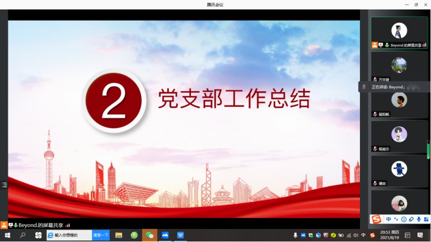 8月19日,OK138太阳集团研究生第二党支部召开线上党史学习教育专题组织生活会。支部书记吴青松同志向大家汇报了最近半年的党支部工作情况,如参观八七会议旧址、红楼、辛亥革命博物馆、观看建党100周年直播等。希望大家继续保持自身优点,对于做的不够好的地方,希望大家在会后针对具体问题逐一提出整改措施,及时改正,也希望每位党员在以后的学习工作中能做的更好,发挥党员先锋模范作用。