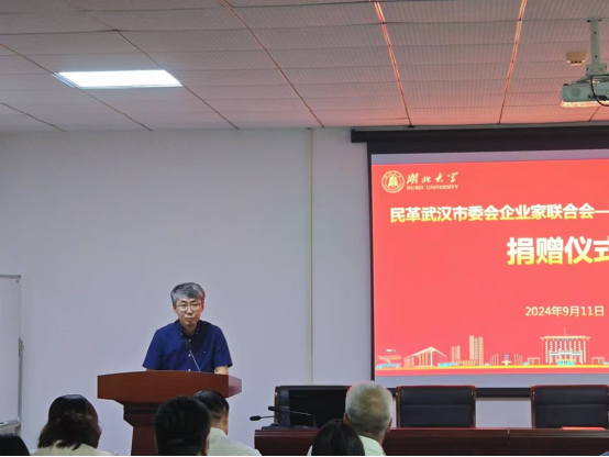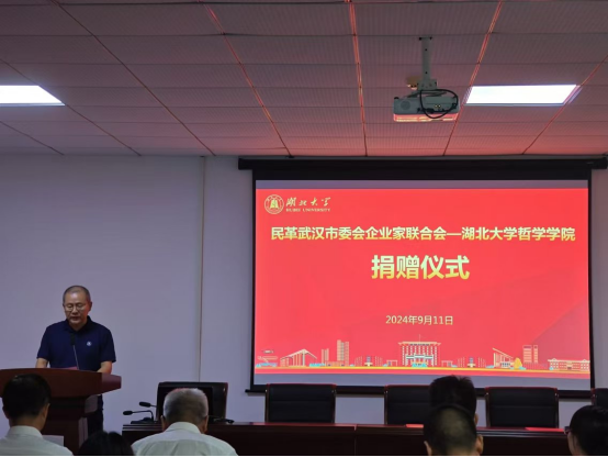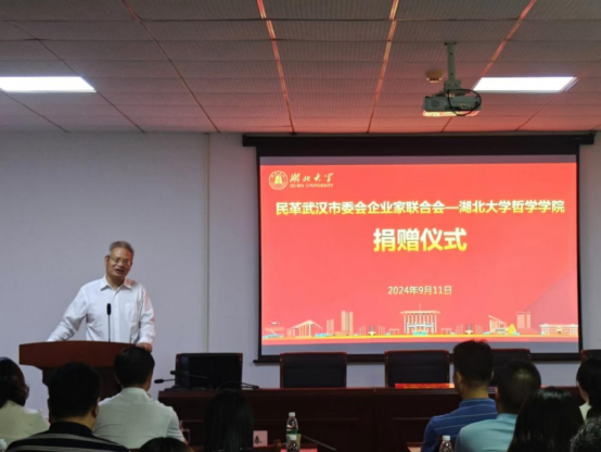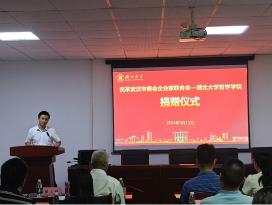 陈文超代表学院致辞。他表示,在彭富春教授的关心和推介下,民革武汉市企业家联谊会和湖大哲院建立起了紧密、顺畅的联系,院企双方在较短时间内就达成了合作意向。他指出,时值ok138cn太阳集团93周年校庆日即将到来之际,此次捐赠签约意义非凡,充分体现了企业的社会责任和教育情怀,体现了企业家的远见卓识和对湖大及OK138太阳集团的期待与信心,必将鼓舞和促进学院加快改革发展步伐,期待形成校企合作、互促共赢的生动局面。他表示,学院将珍惜每一分爱心善款,发挥最大效益,并积极推动校企深度合作。