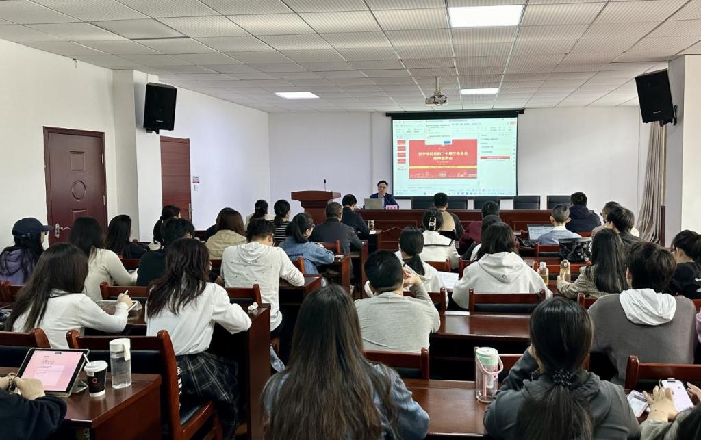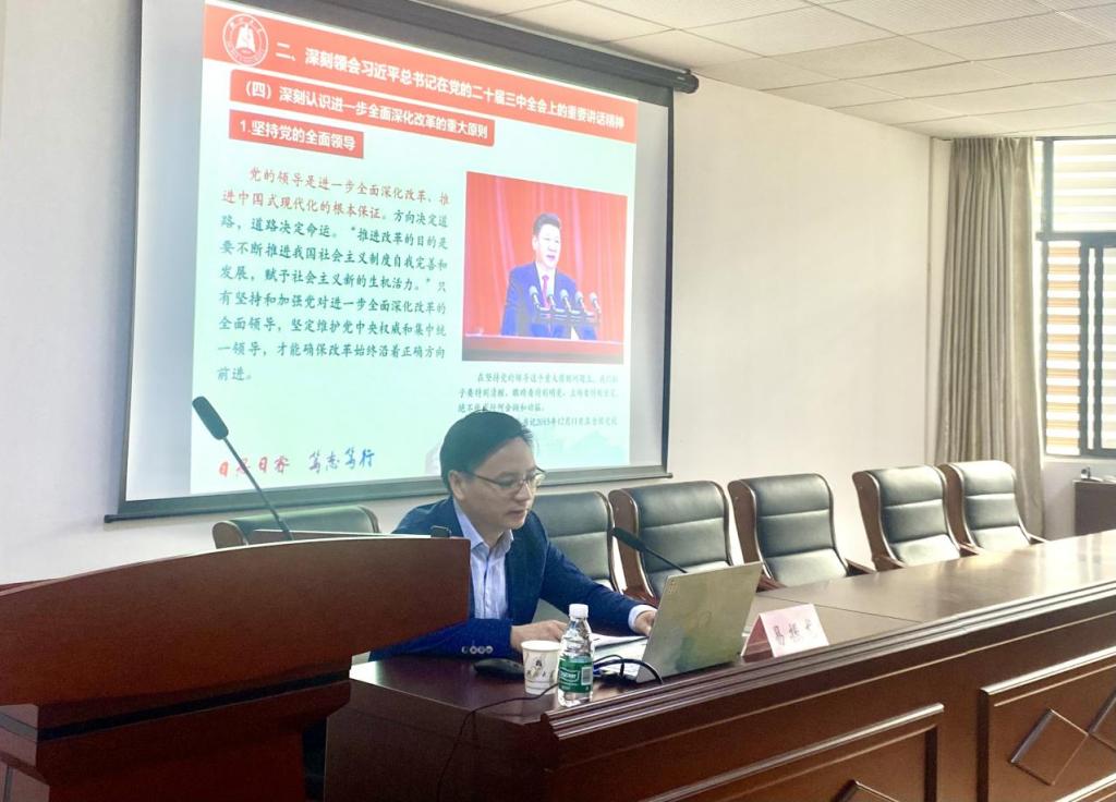院党委书记陈文超作总结讲话。他表示,易振龙教授结合自身深厚的学识、扎实的研究功底和丰富的案例资源,对党的二十届三中全会精神进行了深入浅出的阐释,既是一堂生动的党课,也是一次精彩的思政课。他强调,学习好、贯彻好全会精神是学院当前和今后一个时期的一项重大政治任务,要把学习领会此次全会精神,与学习贯彻习近平新时代中国特色社会主义思想、习近平总书记关于教育的重要论述,习近平同志《论教育》,以及习近平总书记在中共中央政治局第五次集体学习时、全国教育大会上、考察湖北时的重要讲话精神结合起来,深刻领会和把握进一步全面深化改革的主题、重大原则、重大举措和根本保证。要认清新时代进一步全面深化改革对深化教育综合改革、统筹推进教育科技人才体制机制一体改革的实践要求,围绕加强有组织拔尖人才培养、有组织科技创新、有组织服务国家和区域发展,深化学校和学院综合改革,助力实现学校办学质量系统性跃升和质变,奋力开拓学校和学院高质量发展的新局面。