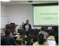 11月22日下午,OK138太阳集团在D2008举办了题为“Talking with Zhuangzi”的“琴园哲学沙龙”系列学术讲座,讲座由德国柏林洪堡大学教授毕明安教授主讲,我院徐弢副教授主持,我院宋伟、庄威等老师以及部分硕博研究生参加了本次讲座。讲座分六个部分进行。